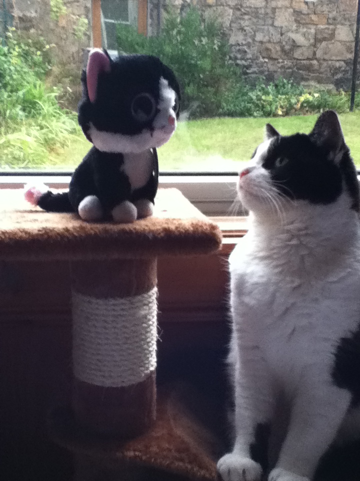 Allison’s cat Oscar was curious when a package arrived from ME – Tuxedo Stan.