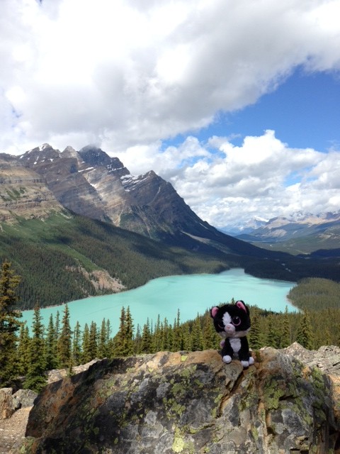 Tuxedo Joseph dines in Banff National Park, AlbertaTuxedo Joseph visits a waterfall in Banff National Park, AlbertaTuxedo Joseph visits Peyto Lake in Banff National Park, Alberta