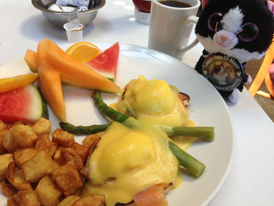Guess who slept in? Now enjoying brunch with smoked salmon eggs Benedict before we go off to the next events.