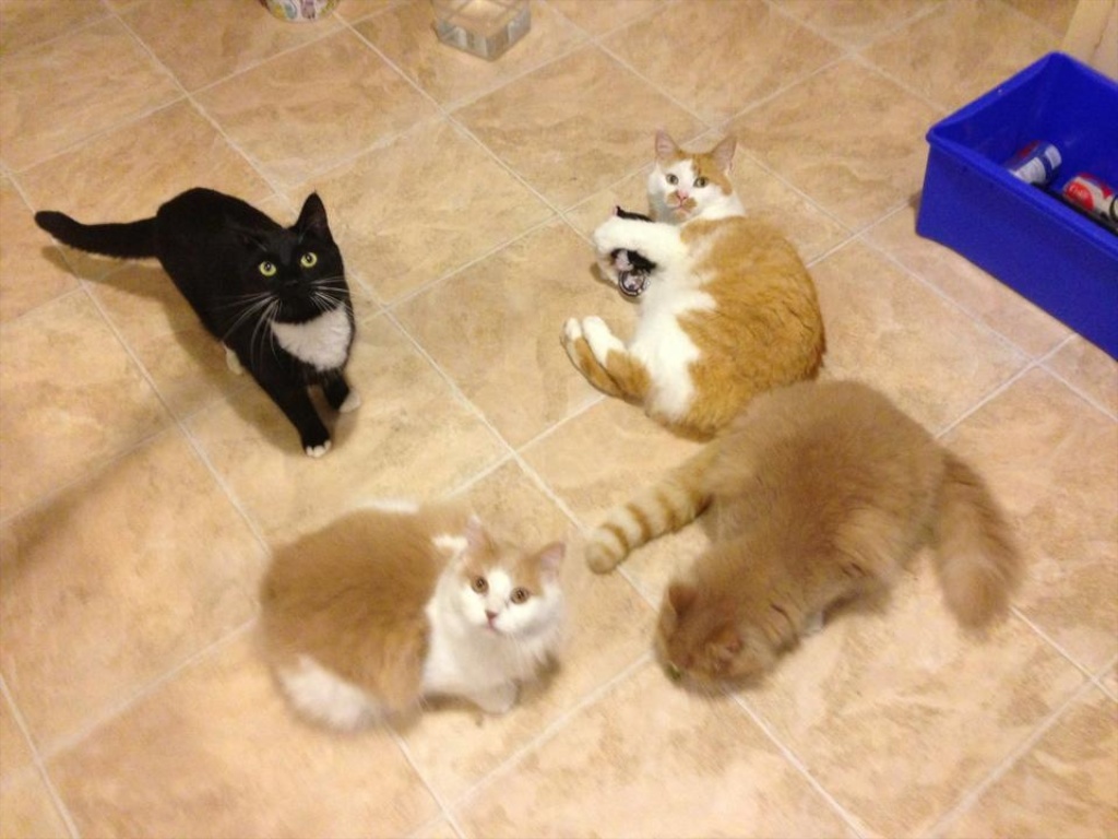 Fresh from a good night sleep and too much ‘nip, Tuxedo Doctor poses in the tail of a sculpture to display his obvious superiority to the canine species.