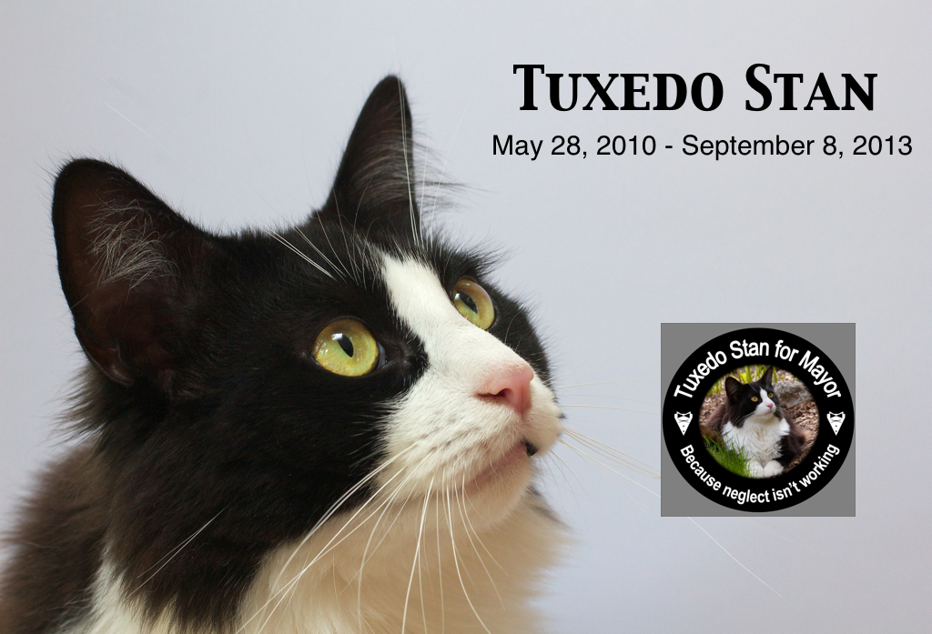 Tuxedo Stan’s battle with cancer ended at 4:55 pm today, September 8, 2013. He was euthanized while lying on his favourite rainbow rug. RIP “Your Worship”