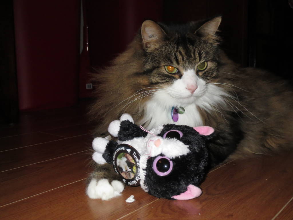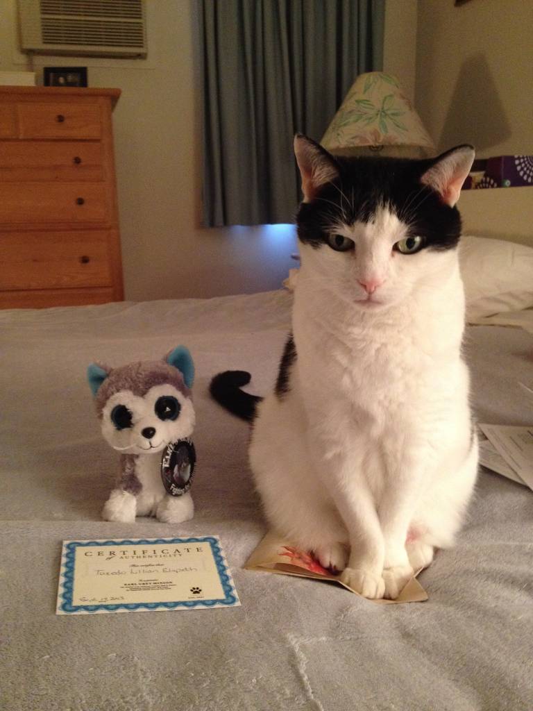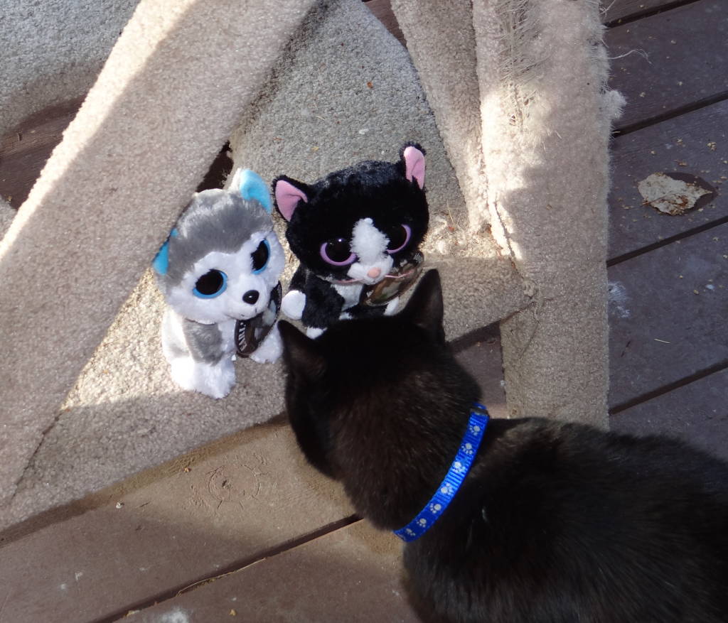 Marlene Shpak sent photos of Minion Daisy Mae meeting her feline family: I arrived in Airdrie, Alberta today and was quickly welcomed by the 3 resident felines at my new home.