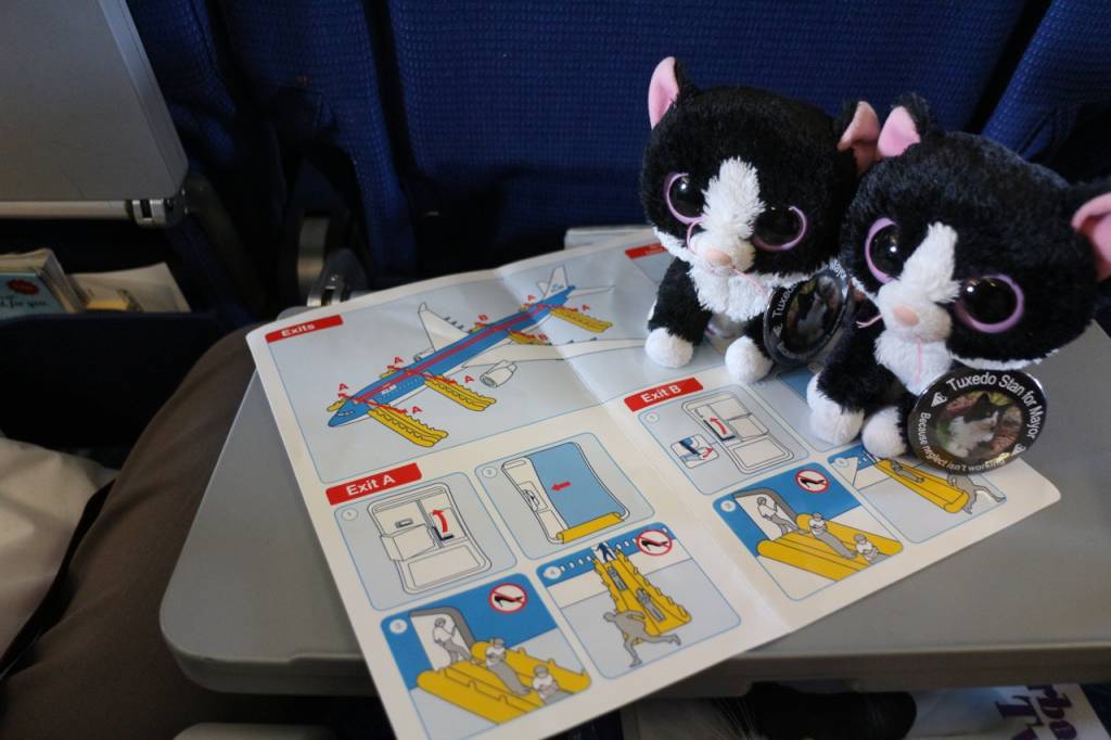 Where will it take them?? Flying somewhere on a very big plane, they carefully study the safety leaflet, but are most eager to start reading the book which features their spiritual leader on the front cover!