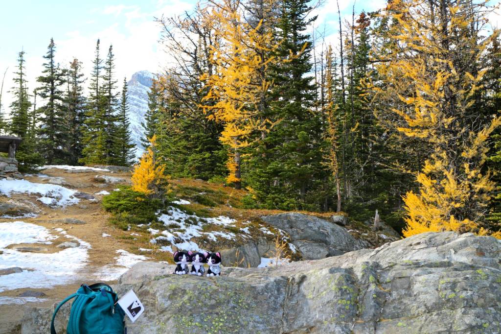 While waiting for skiing season to begin, the intrepid adventurers have taken up rock climbing. First a lovely little peak near Highwood Pass, then another above Lake Louise, trying not to get too tangled up in the ropes! Eager to claim a major summit for the Tuxedo Party, the minions are working hard on their technique.