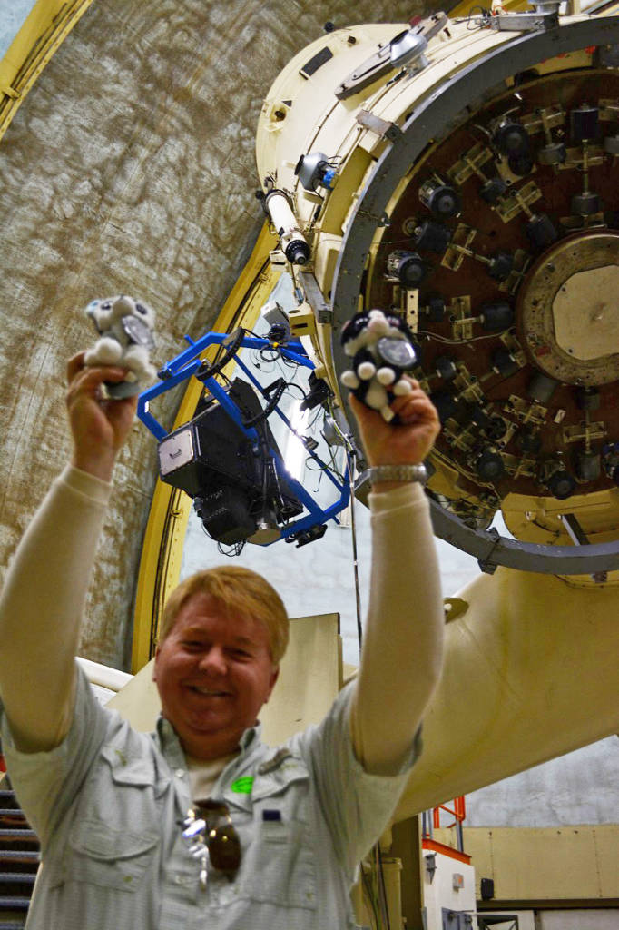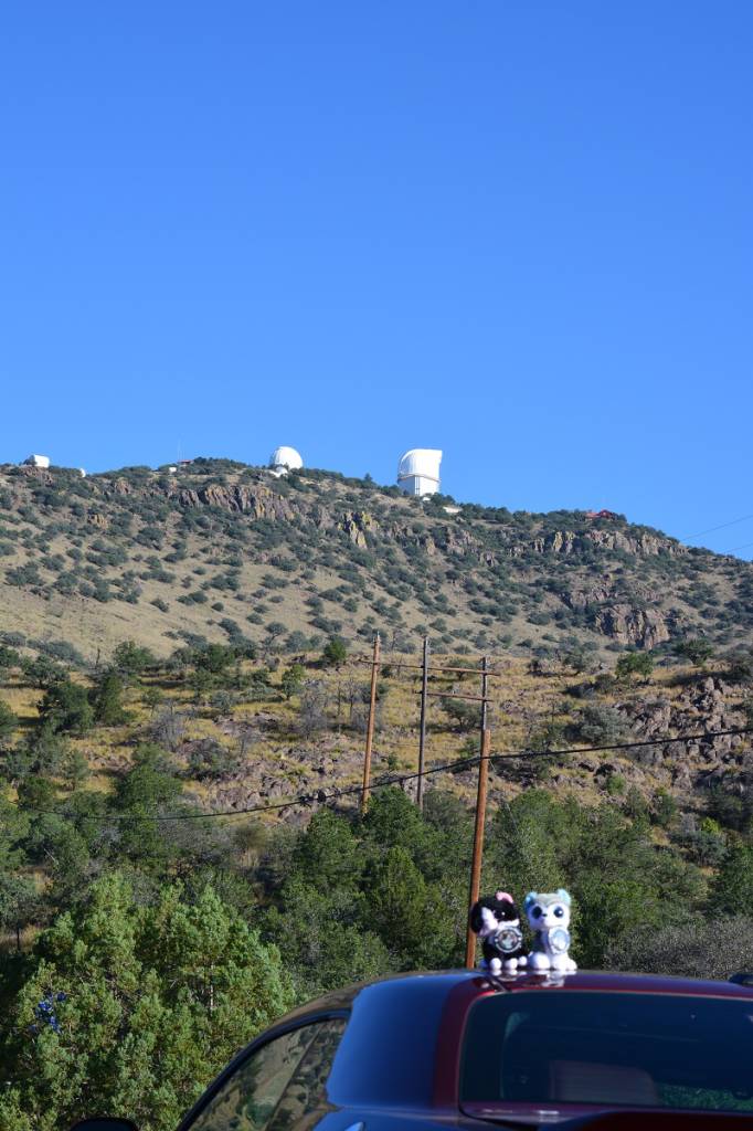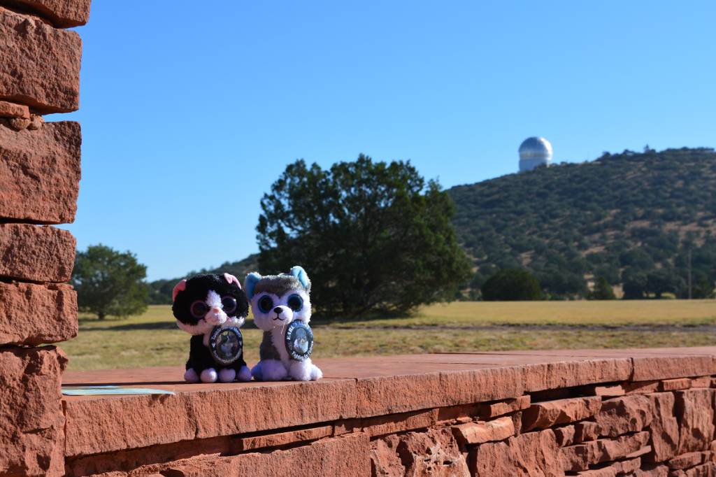 The minions checking out the huge Harlan J. Smith Telescope. This thing is so big, my husband Bob had to hold them up just to try to get them and part of the telescope in the photo! This telescope is called the 2.72 meter telescope because the diameter of the primary mirror is 2.72 meters across. This thing is MASSIVE and the little minions were a little nervous to be under it!