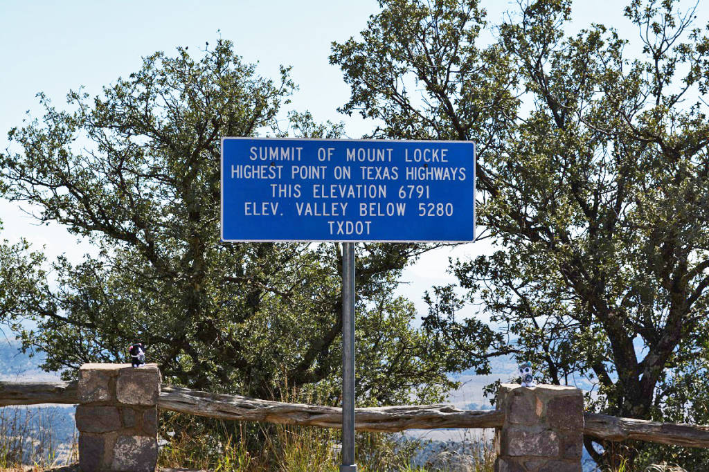 The little minions are a bit hard to see in the photo, but they are sitting on the concrete posts on either side of the sign. This is on top of Mount Locke, with the Harlan J. Smith and Otto Struve telescopes behind me. Mount Locke is not the highest point in Texas, but, as the sign says, it is the highest point reached on Texas highways.
