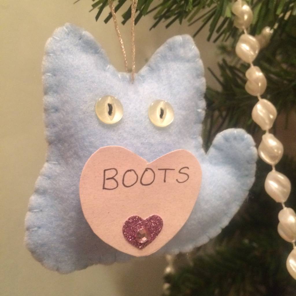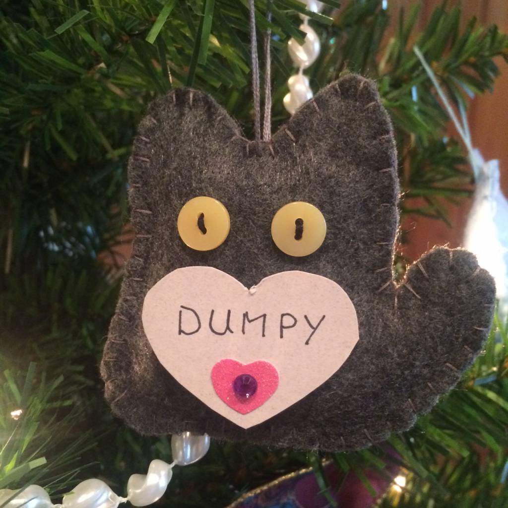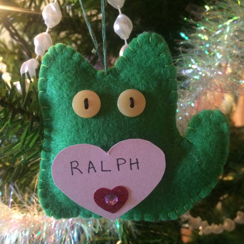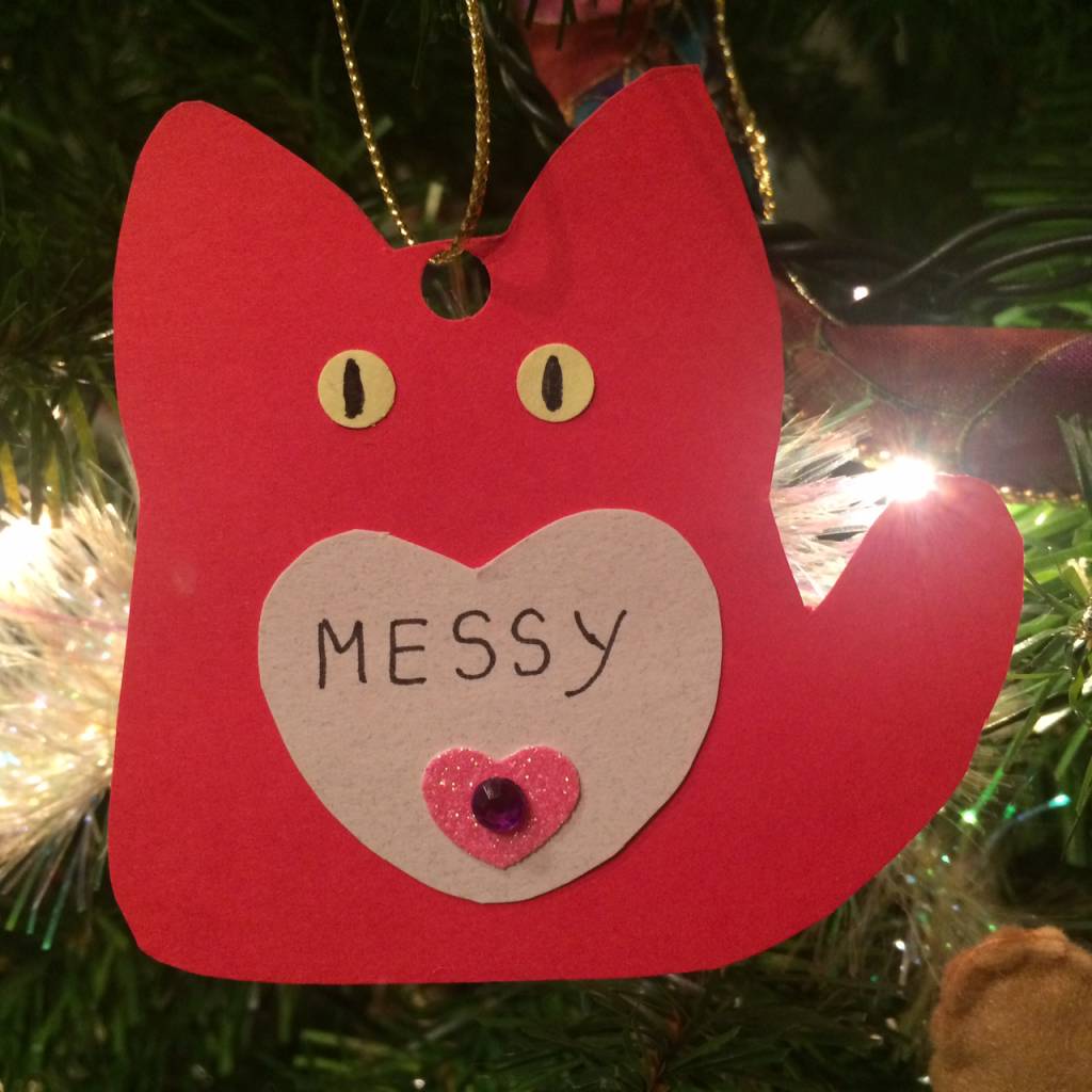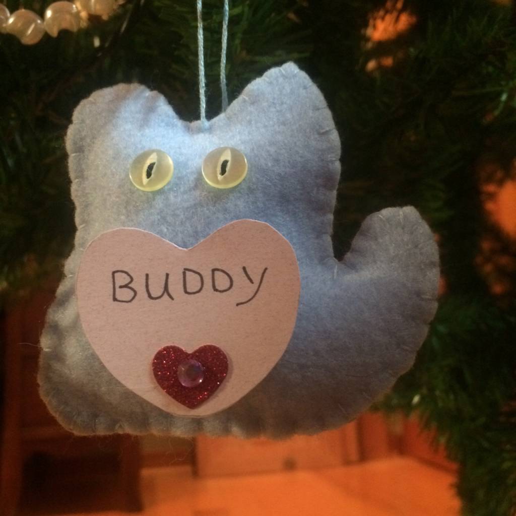 We decorate our tree with cat ornaments in memory of beloved pets so that everyone can share in his dream.