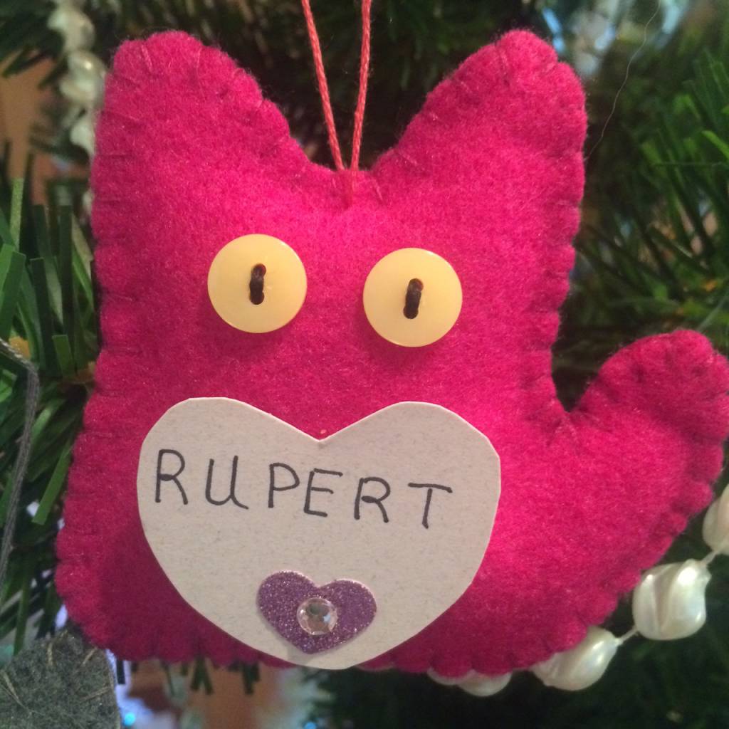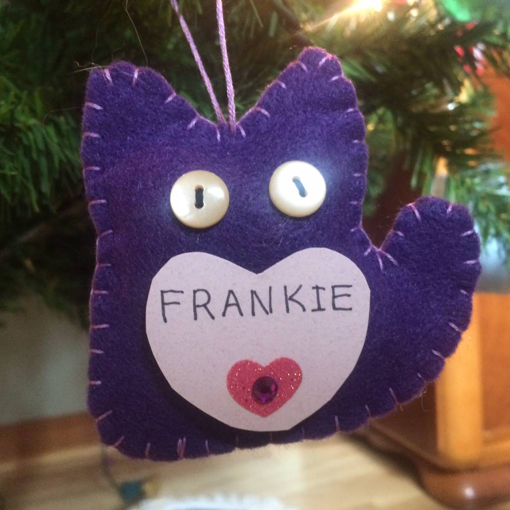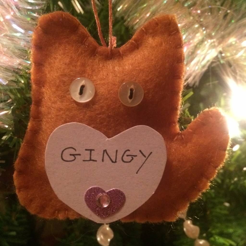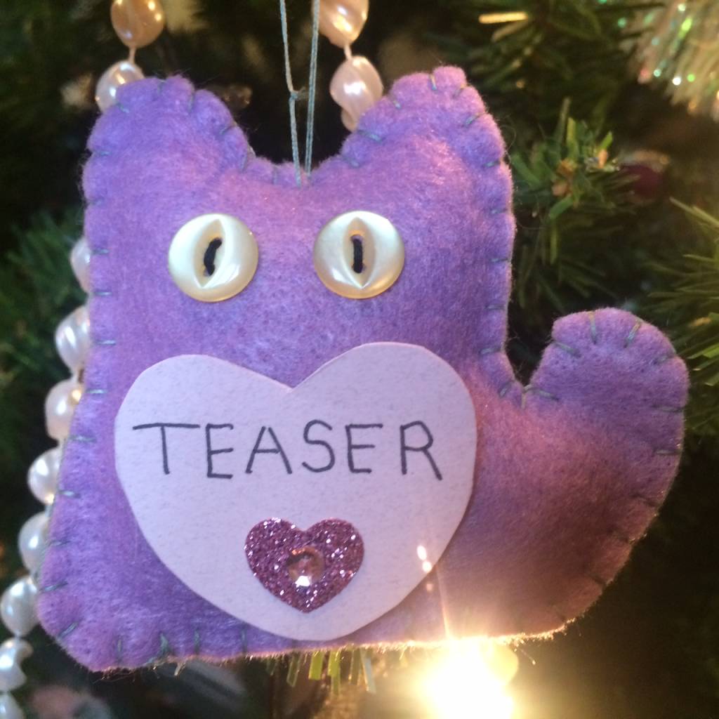 We decorate our tree with cat ornaments in memory of beloved pets so that everyone can share in his dream.