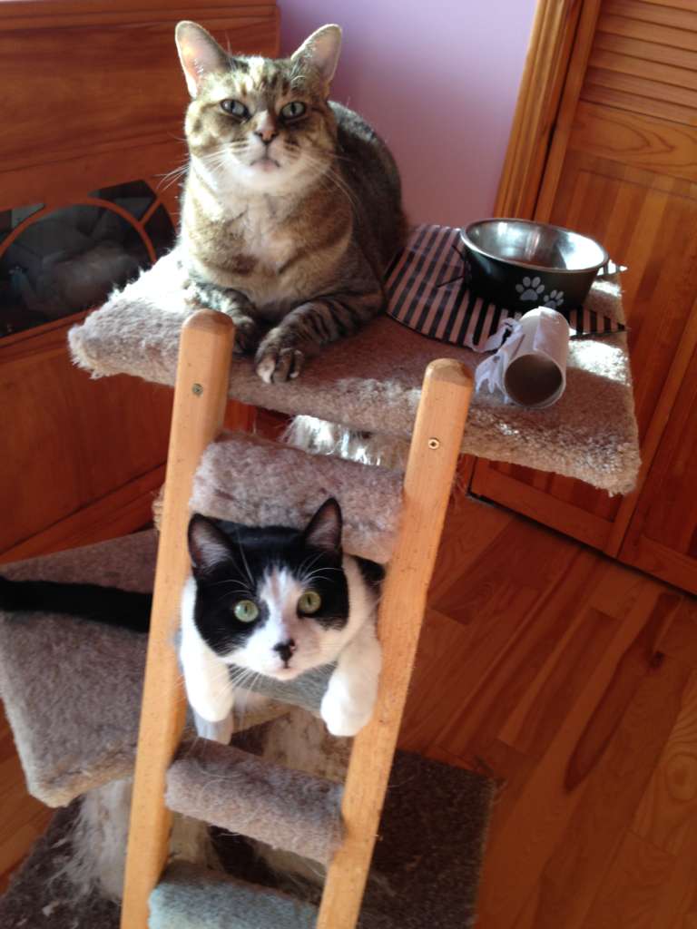 Me and Louise on our cat tree. Please excuse the toilet paper roll!