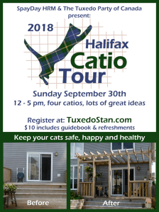 • Register for the Halifax Catio Tour HERE.  Registration is $10 per person; children must be 10 years of age or older. Addresses and tour information will be sent once registration is completed.  In addition to admission to the 4 catios on the tour, the registration fee includes refreshments and the Halifax Catio Tour Guidebook.